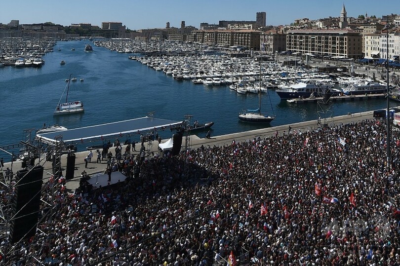 【4月10日 AFP】フランス大統領選が2週間後に迫る中、共産党が支持する極左のジャンリュック・メランション(Jean-Luc Melenchon)候補は9日、南部マルセイユ(Marseille)の屋外で大規模な選挙集会を開き、何万人もの支持者らが集まった。メランション氏の支持率が急上昇している様子が明らかになった格好で、選挙の行方はますます予測不能となっている。