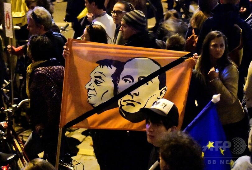 ハンガリーのオルバン・ビクトル(Orban Viktor)首相は、ソロス氏が欧州への移民を奨励して内政に干渉し欧州を弱体化させようとしていると非難しており、教育法改正はオルバン首相のソロス氏攻撃の一環とみられている。(c)AFP/Géza MOLNAR