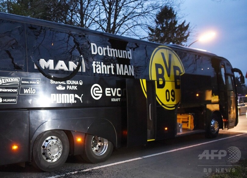 また、ドルトムントのチームバスは強化ガラスを採用していたものの、今回の爆発で複数の窓ガラスが割れる被害を受けたとしている。(c)AFP