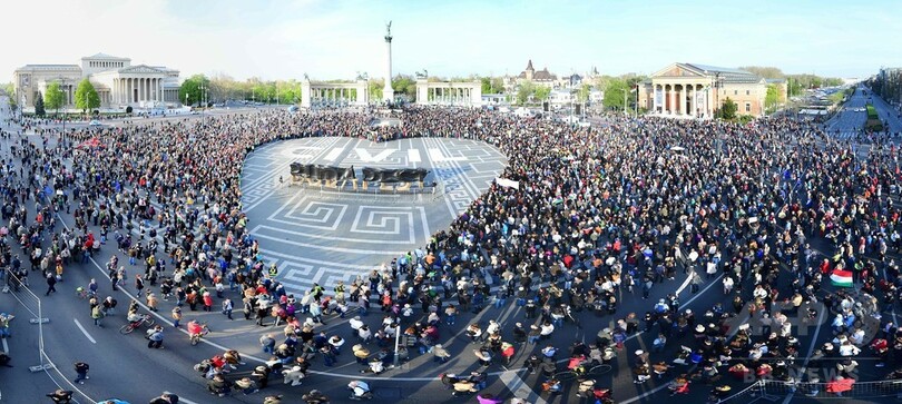 AFPのカメラマンによると、ブダペストの広場で行われたこのデモには約1万人が参加し、人文字で大きなハート形をつくった。