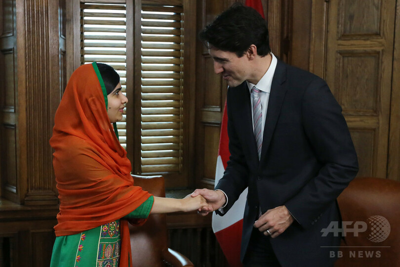 イスラム教の慣習に基づき、明るいオレンジ色のスカーフを頭に巻いたパキスタン出身のマララさんは、首都オタワ(Ottawa)にあるカナダ議会を訪れ、ジャスティン・トルドー(Justin Trudeau)首相と懇談した。