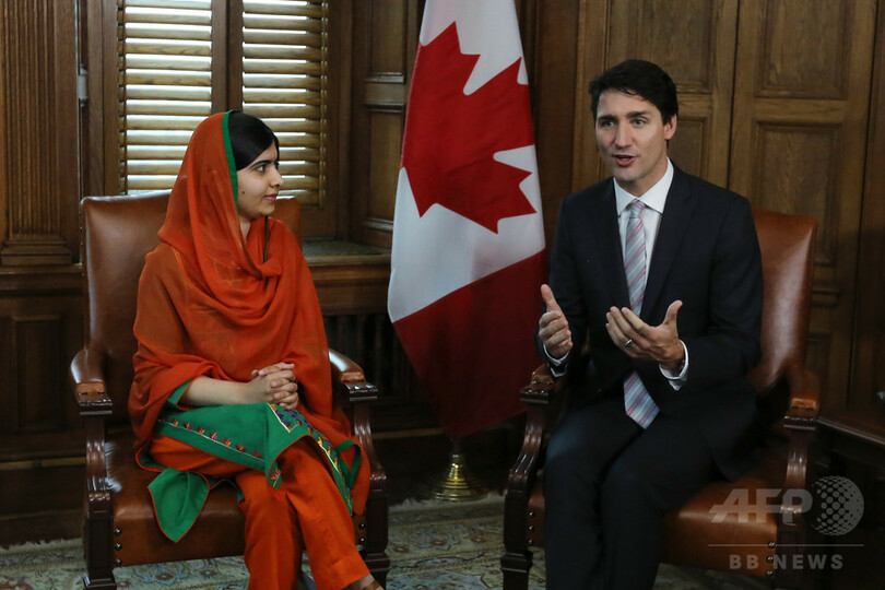 イスラム教の慣習に基づき、明るいオレンジ色のスカーフを頭に巻いたパキスタン出身のマララさんは、首都オタワ(Ottawa)にあるカナダ議会を訪れ、ジャスティン・トルドー(Justin Trudeau)首相と懇談した。