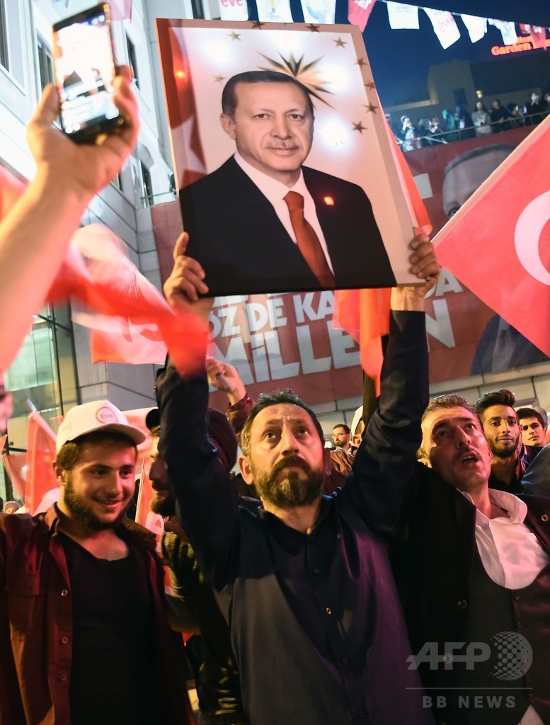 【4月17日 AFP】(写真追加)トルコで16日、大統領権限を強化する憲法改正の是非を問う国民投票が行われ、即日開票の結果、賛成派がわずかな差で勝利した。レジェプ・タイップ・エルドアン(Recep Tayyip Erdogan)大統領はトルコが「歴史的決断」を下したと勝利宣言した。ただ、賛否が拮抗(きっこう)して国内は分断されており、反対派は不正があったと反発している。