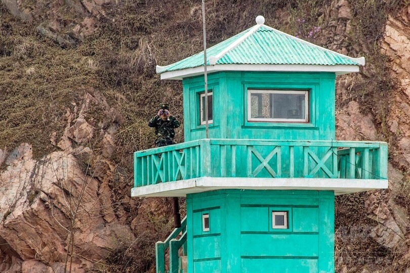 運航する観光船には、木製の緑色の監視塔の上から北朝鮮の兵士が双眼鏡を静かに向けていた。(c)AFP