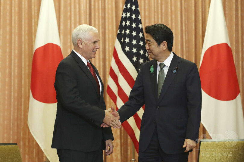 神奈川県の厚木基地(Atsugi Base)に降り立ったペンス副大統領は都内の首相官邸に移動し、安倍晋三(Shinzo Abe)首相と会談した。(c)AFP