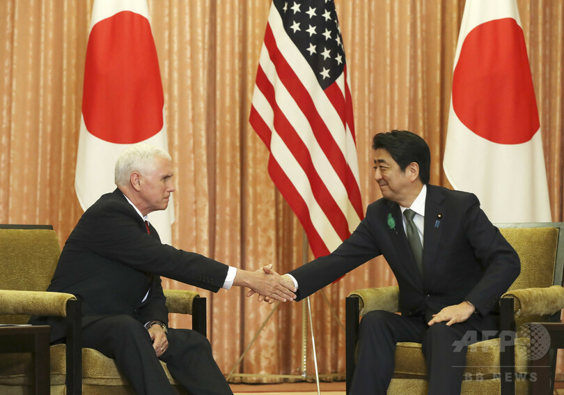 神奈川県の厚木基地(Atsugi Base)に降り立ったペンス副大統領は都内の首相官邸に移動し、安倍晋三(Shinzo Abe)首相と会談した。(c)AFP