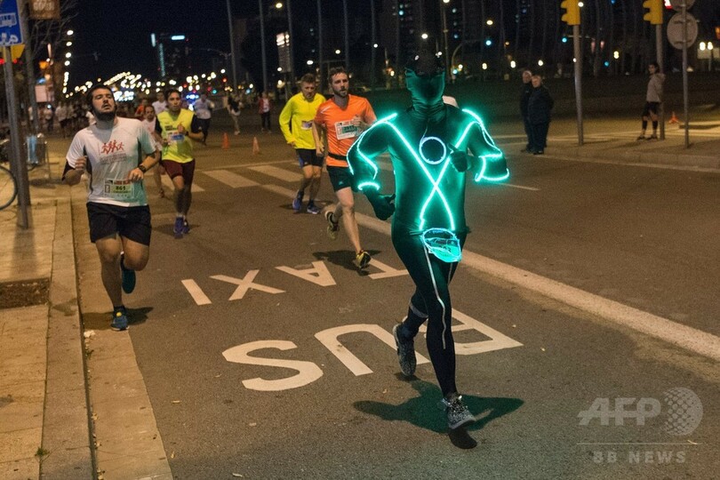 【4月23日 AFP】スペインのバルセロナ(Barcelona)近郊のロスピタレート・デ・リョブレガート(L'Hospitalet de Llobregat)で22日夜、8回目となる夜間マラソン大会が開催された。Tシャツにショートパンツ姿の一般的なランナーに交じって、ネオンのような光を放つ服を着た参加者の姿もみられた。(c)AFP