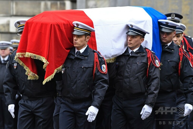 追悼式にはフランソワ・オランド(Francois Hollande)大統領の他、大統領選の決選投票に駒を進めた2人の候補、中道系独立候補のエマニュエル・マクロン(Emmanuel Macron)前経済相(39)と極右政党「国民戦線(FN)」のマリーヌ・ルペン(Marine Le Pen)党首(48)も出席した。
