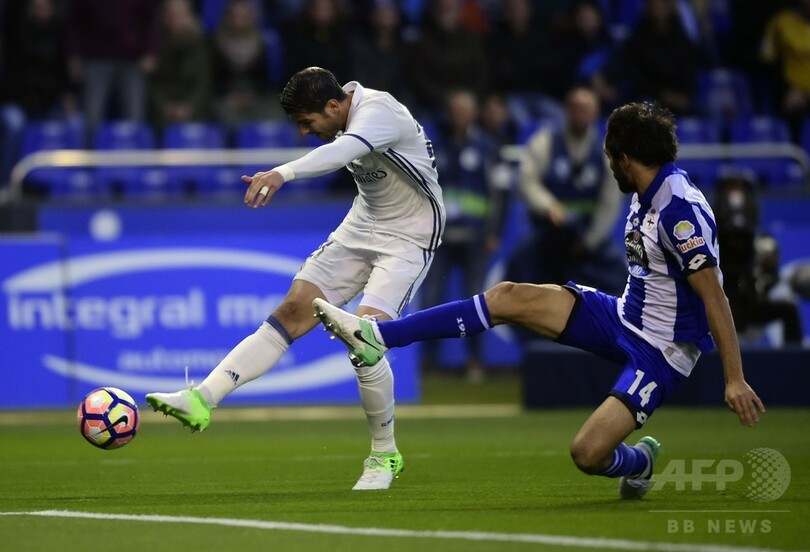 デポルティボのホセル(Joselu)にヘディングシュートをうまく合わせられ、またしても1点を返されたレアルだが、最後に得点を決めたのはやはりレアルで、カゼミーロ(Casemiro)の強烈なミドルシュートが相手GKの手の下をすり抜けてゴールに入った。(c)AFP/Kieran CANNING