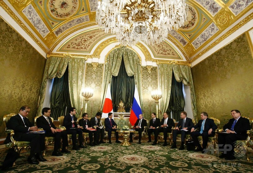 【4月28日 AFP】ロシアのウラジーミル・プーチン(Vladimir Putin)大統領は27日、首都モスクワ(Moscow)で安倍晋三(Shinzo Abe)首相と会談し、北方領土への航空機を使った元島民の墓参を開始することで合意した。