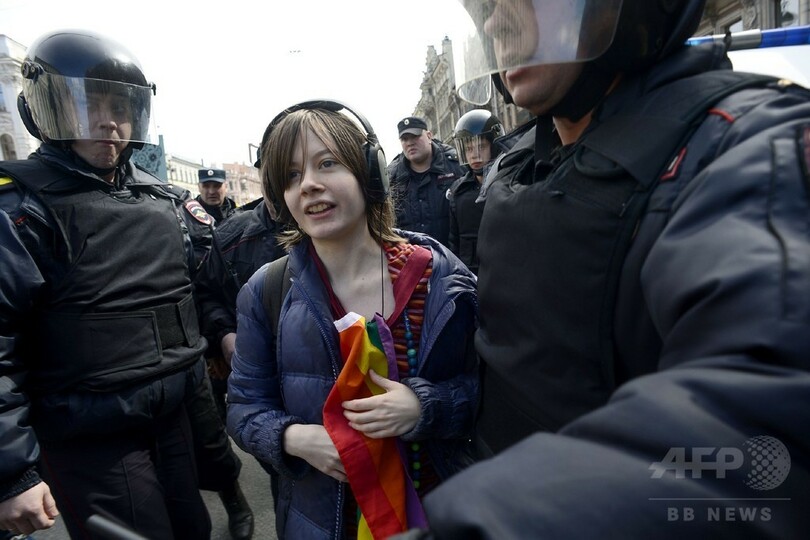 【5月2日 AFP】ロシアのサンクトペテルブルク(St. Petersburg)で1日、メーデー(May Day)に合わせたデモ行進に参加し、南部チェチェン(Chechnya)共和国の当局による男性同性愛者への迫害に抗議していた若い活動家らが、ロシアの警察当局に身柄を拘束された。