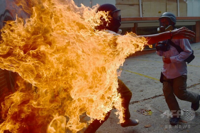 ベネズエラの首都カラカスで火だるまになったデモ参加者(2017年5月3日撮影)。(c)AFP/RONALDO SCHEMIDT