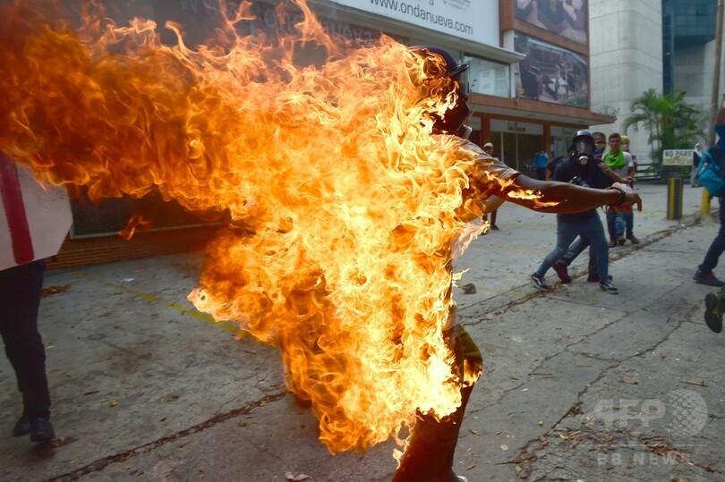 【5月4日 AFP】改憲を目指す大統領の退陣を求めて多数の国民が連日デモを繰り広げているベネズエラで3日、催涙弾を発射する警察と火炎瓶を投げつけるデモ隊が衝突し、首都カラカス(Caracas)ではデモ参加者が火だるまになる事態が発生した。