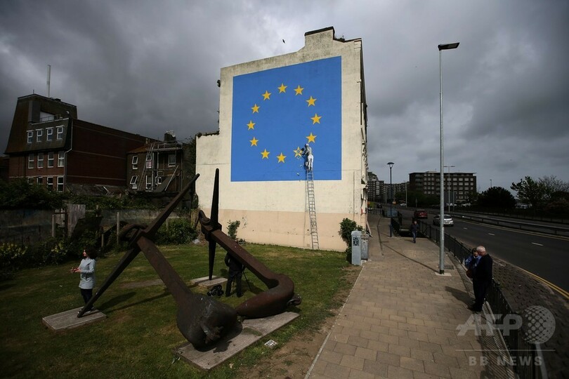 ニュース ライフ バンクシーが初のブレグジット壁画 亀裂走るEU旗描く 2017年5月9日 4:38 発信地:ドーバー/英国 [ ヨーロッパ 英国 ] このニュースをシェア 画像作成中 この写真にはショッキングな表現、または18歳以上の年齢制限の対象となる内容が含まれます。ご覧になる場合にはご了承の上、クリックしてください。 この画像を見る ❯ {{photo.ind}}/18 画像作成中 {{photo.ind}}/18 画像作成中 ! 【5月9日 AFP】覆面グラフィティアーティスト、バンクシー(Banksy)が英国の欧州連合(EU)離脱(ブレグジット、Brexit)を初めてテーマにして描いた壁画が7日、英南東部の港町ドーバー(Dover)にある民家の外壁に出現した。 フランスの対岸にあるドーバーは、英国内で欧州大陸に一番近い場所。壁画には、はしごに登ったつなぎ姿の作業用の男が、EU旗に描かれた12個の星の一つをのみと木づちで削り取り、青いEU旗全体に亀裂を生み出している様子が描かれている。(c)AFP ライフ 一覧へ> メディア・報道関係・法人の方向け 写真・動画 購入のお問合せ>