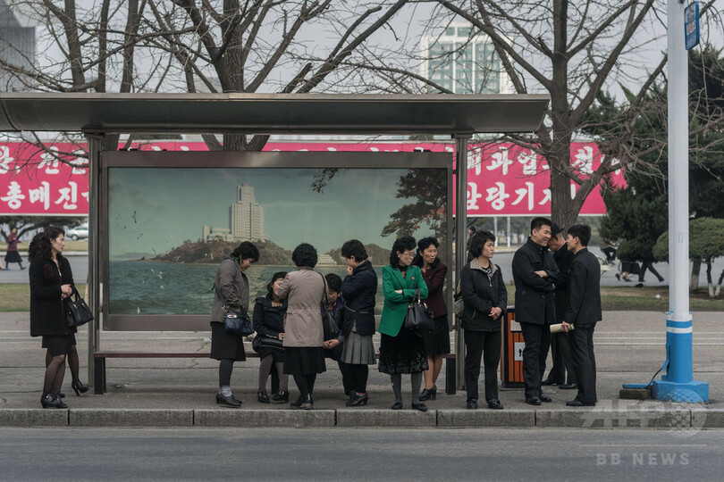 平壌では通勤する、グループ活動に向かうなど、ほとんどの人が目的を持っているように見える。だが、バス停でバスを待つ間は、人々はその目的を中断せざるを得ない。友人や同僚と会話をしたり、物思いにふけながら往来を眺めたり、あるいはスマートフォンで遊んだり、バス停でバスを待つ時間は個人の興味関心があらわになる。(c)AFP