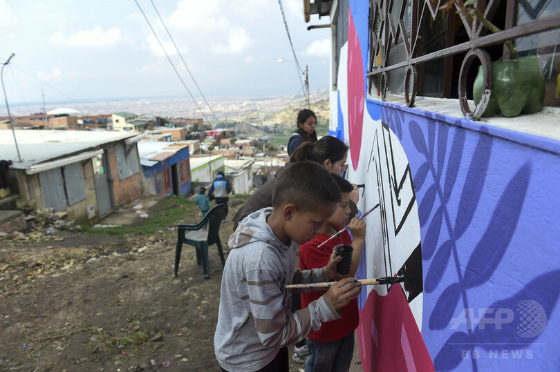 【5月16日 AFP】コロンビア首都ボゴタ(Bogota)南部のソアチャ(Soacha)地区で先月、内戦の犠牲者たちが「団結」の文字をモチーフとしたグラフィティを家の壁に描いた。フランス人アーティスト、セブ・トゥーサン(Seb Toussaint)さんのグローバルプロジェクト「Share The Word」(世界を共有しよう)の一環。