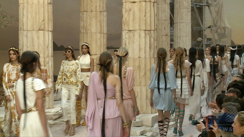 【5月9日 Parismodes.tv】「シャネル(CHANEL)」が、仏パリで17/18年クルーズ・コレクションを発表した。会場であるグラン・パレ(Grand Palais)は大理石の柱と岩のセットで、古代ギリシャのように一変。デザイナー、カール・ラガーフェルド(Karl Lagerfeld)がインスピレーションを得たのは、ギリシャ神話の世界だという。(c)Parismodes.tv
