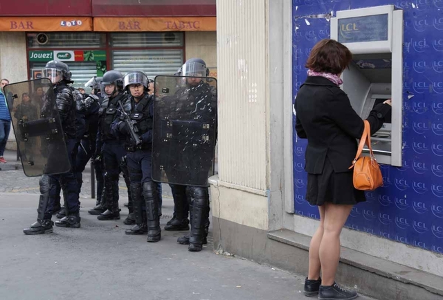 私は自分の写真にざっと目を通すと、そのうちの1枚をAFP編集部に送り、その写真が配信に値するかどうか尋ねてみた。使いたいという返事だったので、私はオフィスに赴いて写真をダウンロードした。私がいた場所からそれが可能な機材を持ち合わせていなかったからだ。AFPは私にそのための機材に加え、ヘルメットを渡してくれた。私は再びデモの現場に戻った。ヘルメットにはAFPのステッカーを貼っておいた。そうしておけば、警察も私を報道カメラマンと認識してくれるはずだ。確かに相手側の態度は一変した。「シルブプレ、ムッシュー(そちらのお方、こちらへどうぞ)」と言葉遣いも大きく変わった。
