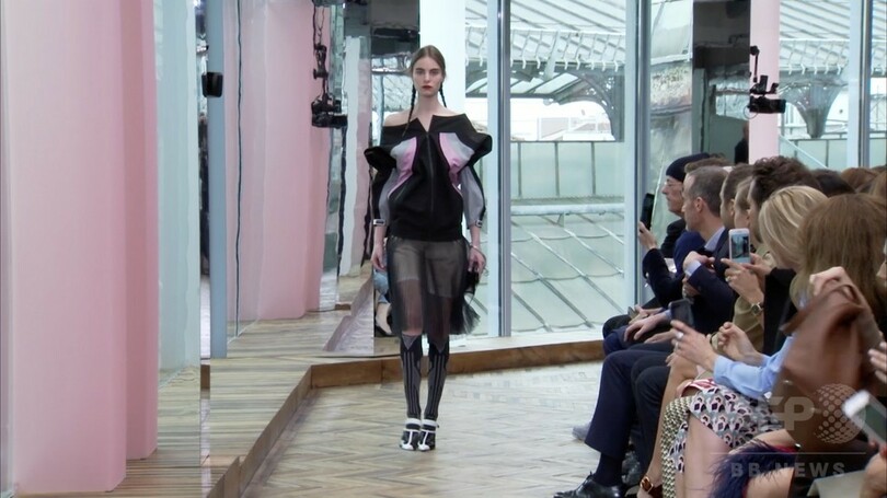 繊細なチュールはギャザーやラッフルにあしらわれ、刺繍やスパンコールがアーティスト、ジェームズ・リーン(James Lean)によるうさぎや花柄のプリントの上に施された。真っ赤な口紅のモデルたちはスポーツソックスをスニーカーやポインテッドシューズに合わせ、長い三つ編みに羽根やヘッドバンドをアクセサリーとしてまとった。(c)Parismodes.tv