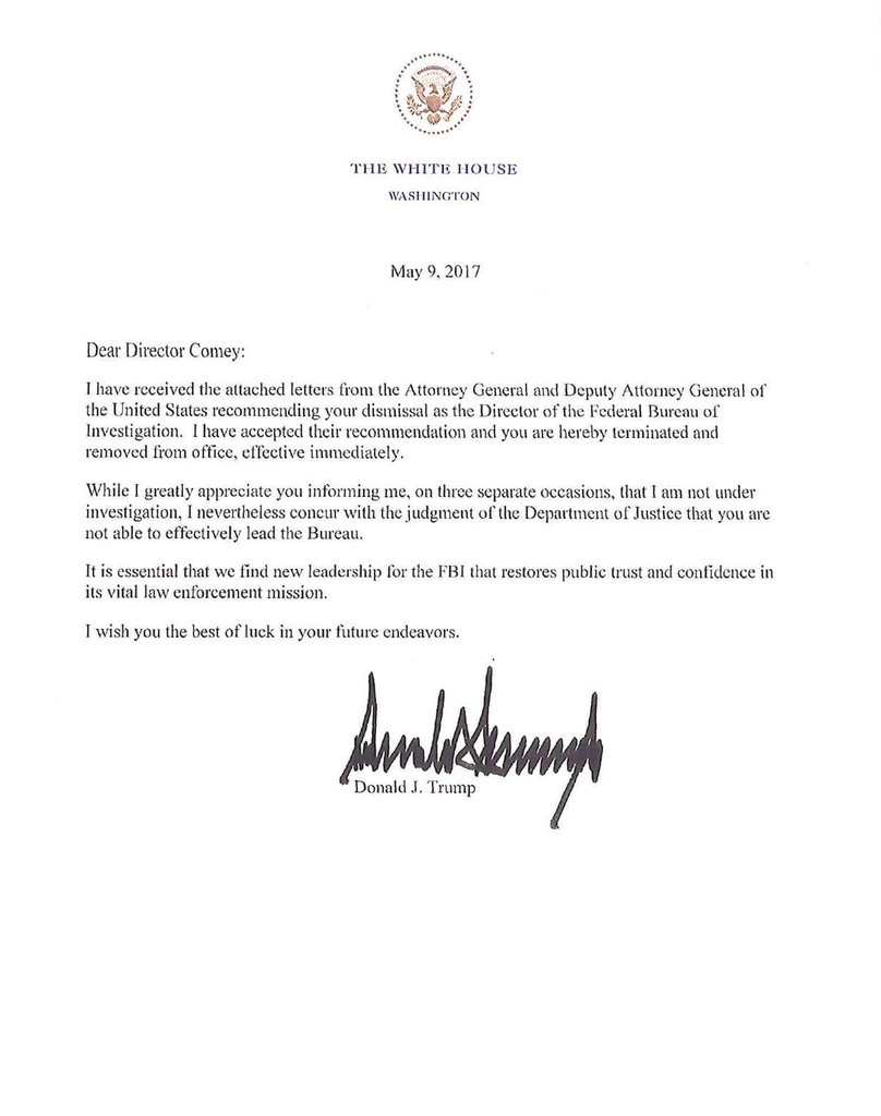 コミー氏は、FBI職員らに宛てた書簡の中で「大統領はどんな理由でも、あるいは全く理由がなくても、FBI長官を解任できるものだと長年思っている。今回の決定や、その決定が実行された経緯について、時間を費やすつもりは私にはない。皆さんにもそうしてほしい。もう終わったことであり、皆さんや職務から離れることは非常に残念だが、私は大丈夫だ」と述べている。