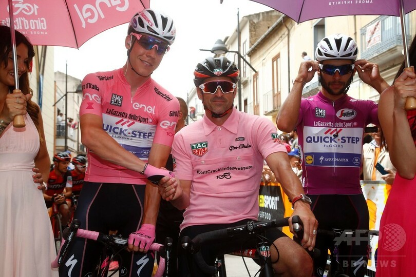 【5月13日 AFP】ジロ・デ・イタリア(Giro d'Italia 2017)は12日、第7ステージ(カストロヴィッラリからアルベロベッロ、224キロメートル)が行われ、米俳優のパトリック・デンプシー(Patrick Dempsey)がビンテージのピンクジャージー(マリア・ローザ)を着用しながら、集団とともにスタートラインまで走行して注目を浴びた。