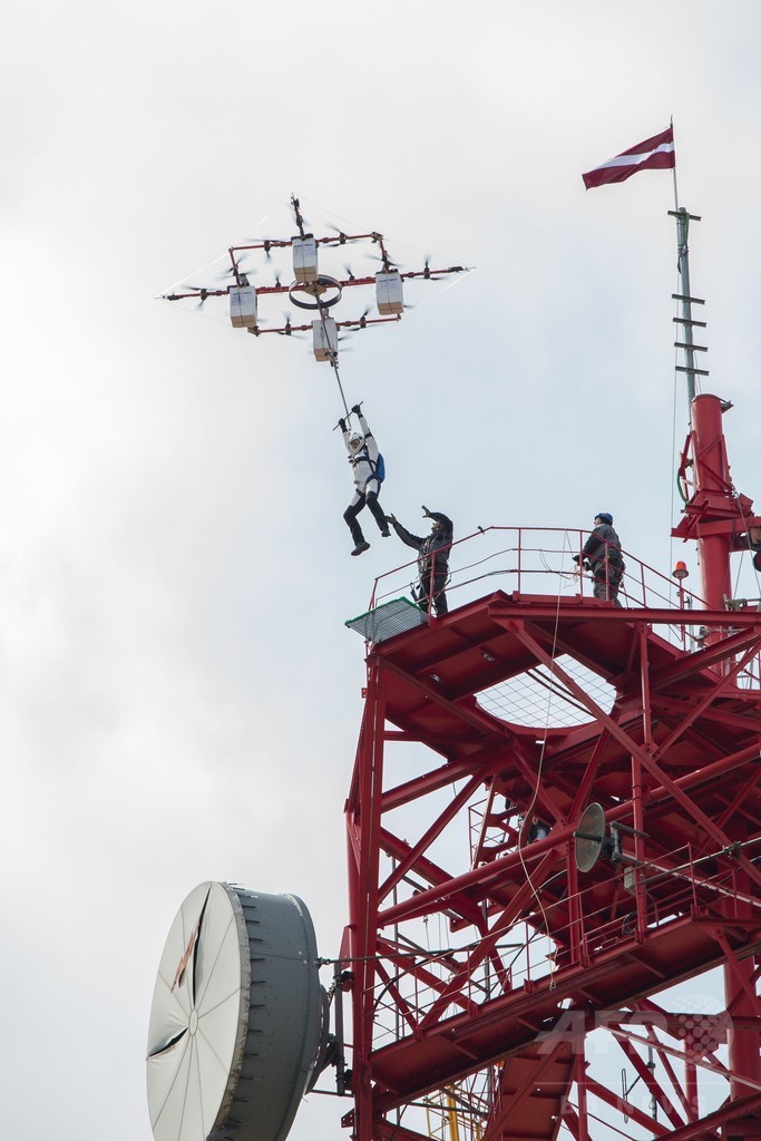 ラトビア中央部にある孤立した広大な地域で非公開で行われた「ドローンダイビング」実験にAFPは独占取材を許された。強力なドローンの大きさは3.2平方メートルで、16個のローター(回転翼)付き。重量は70キロで、最大200キロまで持ち上げることができる。