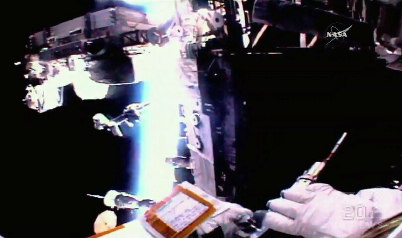 飛行士の宇宙服に電力を供給する装置に「わずかな水漏れ」が発見されたため、この日の作業開始は予定より少し遅れた。
