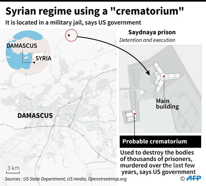 米国務省は、シリアの首都ダマスカス(Damascus)北郊のサイドナヤ(Saydnaya)軍事刑務所で大量殺害が行われているという報告の裏付けになるとする衛星写真を公開。ロシア政府に対し、バッシャール・アサド(Bashar al-Assad)大統領の犯罪行為を看過してはならないと警告した。