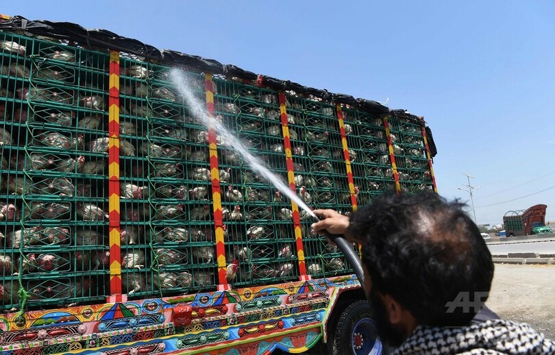 【5月16日 AFP】パキスタンのペシャワル(Peshawar)にあるガソリンスタンドで先週末、アフガニスタンに向かうニワトリをのせたトラックに水をかけるドライバーの姿が見られた。パキスタンのほぼ全域に高温と乾燥が広がっている。(c)AFP