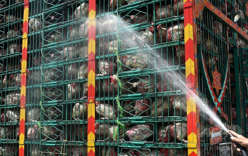 【5月16日 AFP】パキスタンのペシャワル(Peshawar)にあるガソリンスタンドで先週末、アフガニスタンに向かうニワトリをのせたトラックに水をかけるドライバーの姿が見られた。パキスタンのほぼ全域に高温と乾燥が広がっている。(c)AFP