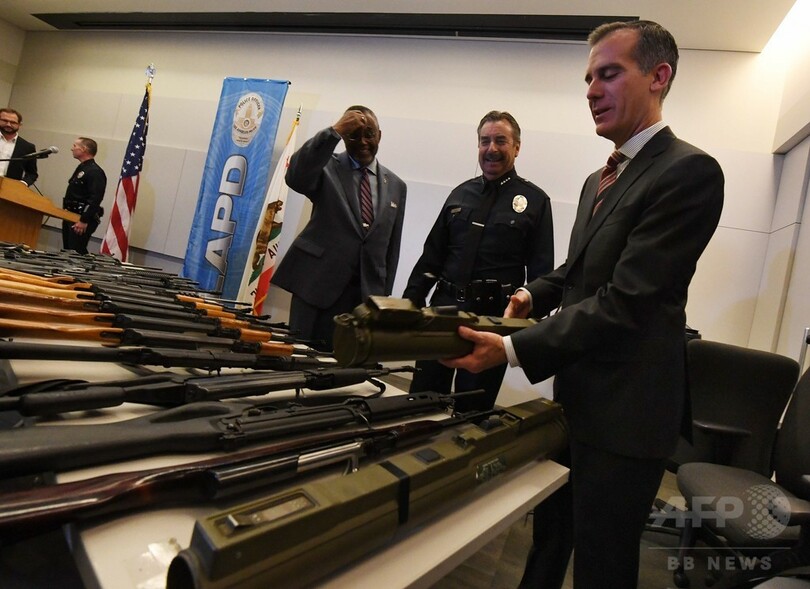 【5月20日 AFP】米カリフォルニア(California)州ロサンゼルス(Los Angeles)の警察本部で19日、市民から匿名で銃器を買い取る計画の「成果」を同市のエリック・ガルセッティ(Eric Garcetti)市長が披露し、記者会見を行った。