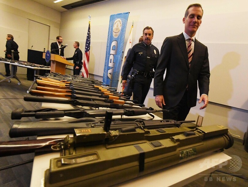 【5月20日 AFP】米カリフォルニア(California)州ロサンゼルス(Los Angeles)の警察本部で19日、市民から匿名で銃器を買い取る計画の「成果」を同市のエリック・ガルセッティ(Eric Garcetti)市長が披露し、記者会見を行った。