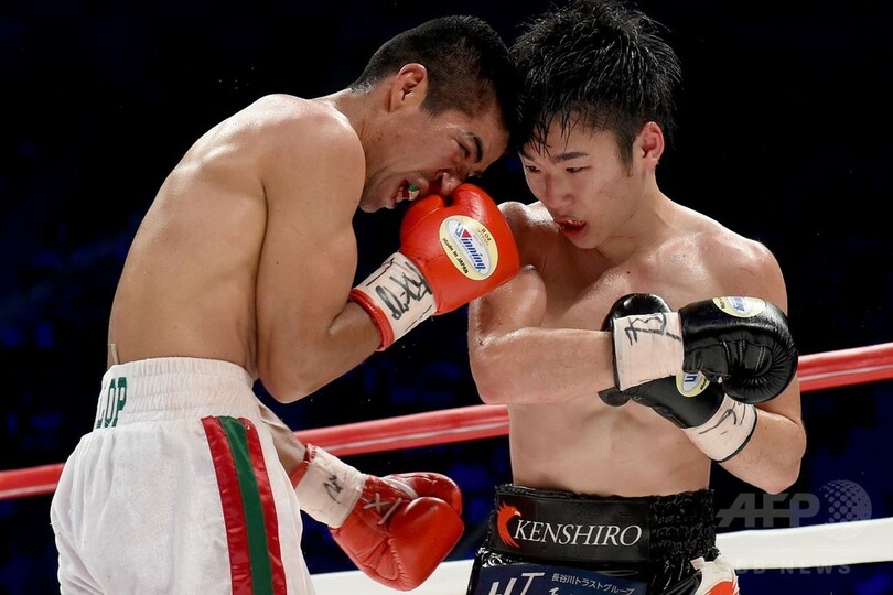 有明では同日、ほかにも世界タイトルマッチが2試合行われ、WBC世界フライ級タイトルマッチ12回戦では比嘉大吾(Daigo Higa)が、WBC世界ライトフライ級タイトルマッチ12回戦では拳四朗(Ken Shiro)が、それぞれ王座を獲得した。(c)AFP