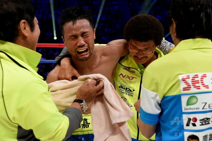 有明では同日、ほかにも世界タイトルマッチが2試合行われ、WBC世界フライ級タイトルマッチ12回戦では比嘉大吾(Daigo Higa)が、WBC世界ライトフライ級タイトルマッチ12回戦では拳四朗(Ken Shiro)が、それぞれ王座を獲得した。(c)AFP