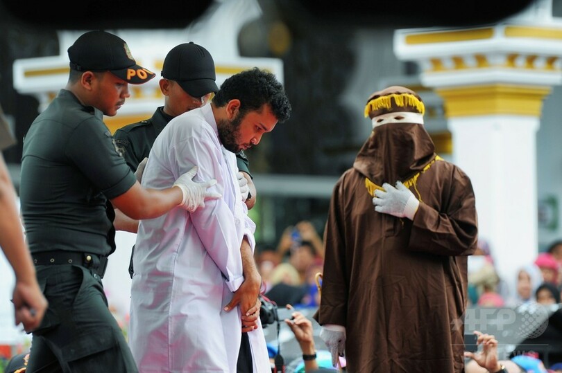 【5月23日 AFP】インドネシア・アチェ(Aceh)州の州都バンダアチェ(Banda Aceh)で23日、同性同士で性行為をし、シャリア(イスラム法)に違反したとして有罪判決を受けた男性2人に対し、それぞれ83回の公開むち打ち刑が執行された。アチェ州はインドネシアで唯一シャリアが適用されているが、同性カップルにこのような処罰が行われたのは初めて。