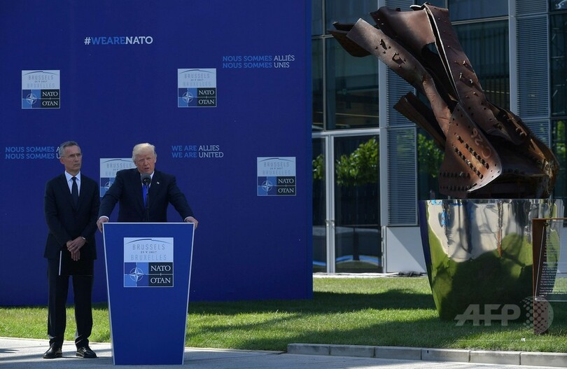 トランプ大統領は、NATOの新本部庁舎で行われた、2001年の米同時多発攻撃を記念する展示作品の公開式典で演説。初のNATO首脳会議出席という大きな注目が集まる機会を利用し、NATO加盟国の負担金不足分は「多額」にのぼるとの批判を展開した。また、英マンチェスター(Manchester)の爆破事件に触れ、加盟国に対してテロや移民政策に対してより強硬な姿勢を取るよう求めた。