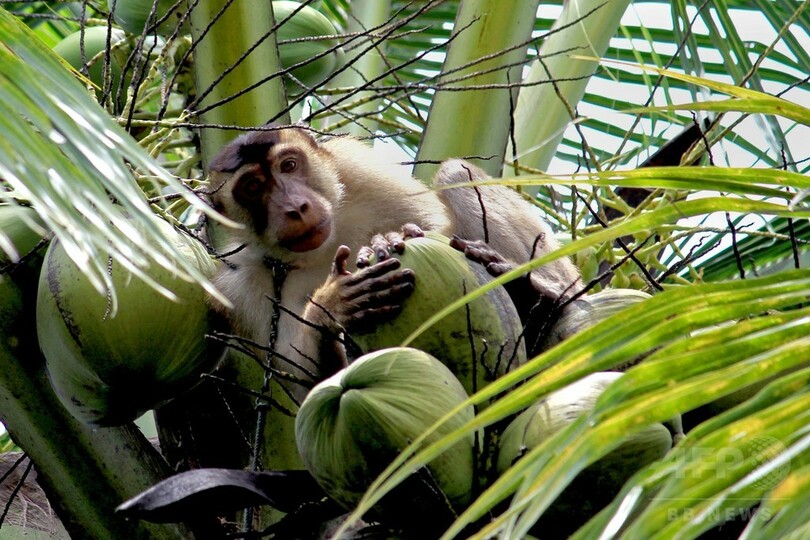 【5月27日 AFP】インドネシア・スマトラ(Sumatra)島パダン・パリアマン(Padang Pariaman)県ではココナツを取るためにサルが使われている。こうしたサルは市場で売買され、安くて8ドル(約900円)ほどだが、よく訓練された若いオスにはその10倍の値段がつくこともある。(c)AFP
