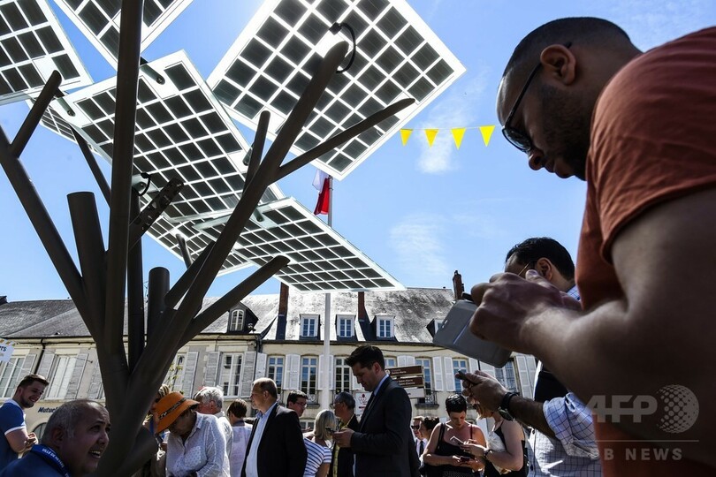 【5月30日 AFP】フランス中部の町ヌベール(Nevers)で29日、巨大な正方形のソーラーパネルを葉っぱに見立てた「ソーラーツリー」がお目見えした。通行中に立ち寄って携帯電話の充電やネットサーフィンを楽しむことができるほか、単に「木陰」で休むこともできる。