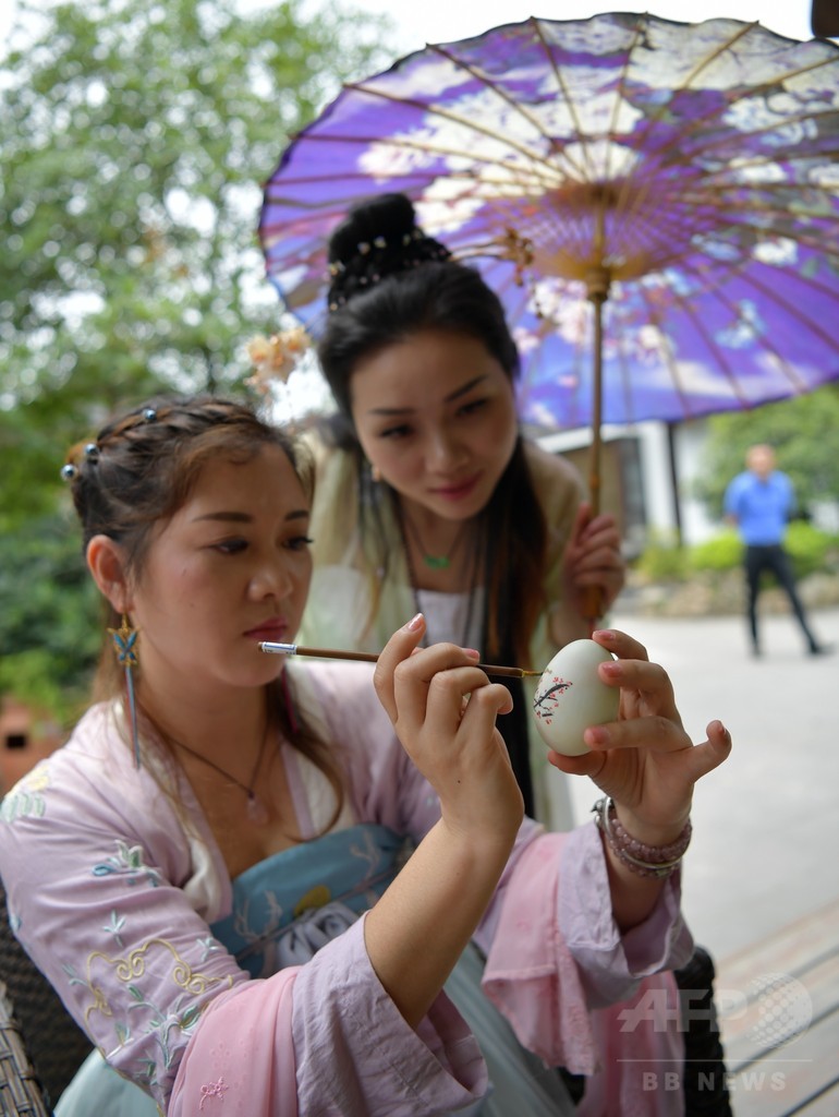 【5月30日 CNS】三大節句の一つに数えられる端午節を翌日に控え、中国四川(Sichuan)省楽山(Leshan)市では29日、古代漢民族の衣装を身に着けた観光客らが、巨大仏「楽山大仏(Leshan Giant Buddha)」周辺や嘉定坊街(Jiading Square Street)を行き交った。若い男女たちは手を清めて、線香を立てたり、香り袋を作ったり、卵に絵を描いたり、ちまきを包んだりと、古代の礼儀を習い、端午節の伝統を体験した。(c)CNS/JCM/AFPBB News