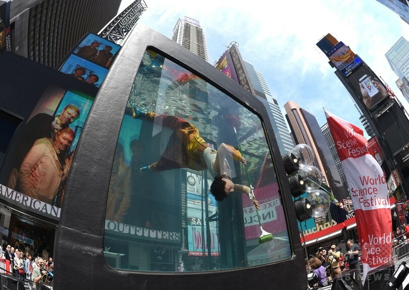 【6月1日 AFP】ドナルド・トランプ(Donald Trump)米大統領が地球温暖化対策の国際枠組み「パリ協定(Paris Agreement)」に関する決断を「あと数日で」発表すると明らかにし、世界が注視する中、ニューヨーク(New York)のタイムズスクエア(Times Square)に登場した巨大水槽の中で、気候科学をテーマにしたパフォーマンスアートが行われた。