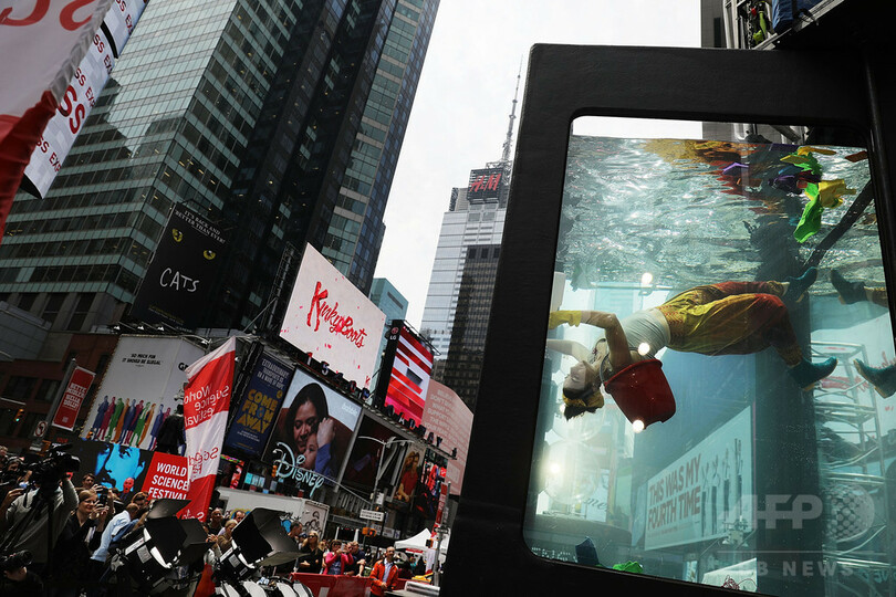 【6月1日 AFP】ドナルド・トランプ(Donald Trump)米大統領が地球温暖化対策の国際枠組み「パリ協定(Paris Agreement)」に関する決断を「あと数日で」発表すると明らかにし、世界が注視する中、ニューヨーク(New York)のタイムズスクエア(Times Square)に登場した巨大水槽の中で、気候科学をテーマにしたパフォーマンスアートが行われた。