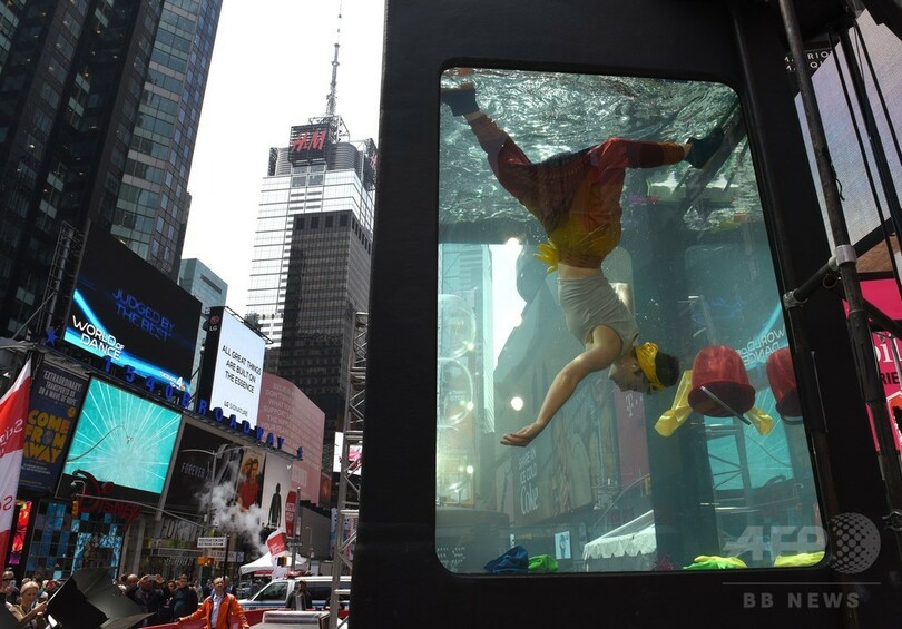 【6月1日 AFP】ドナルド・トランプ(Donald Trump)米大統領が地球温暖化対策の国際枠組み「パリ協定(Paris Agreement)」に関する決断を「あと数日で」発表すると明らかにし、世界が注視する中、ニューヨーク(New York)のタイムズスクエア(Times Square)に登場した巨大水槽の中で、気候科学をテーマにしたパフォーマンスアートが行われた。