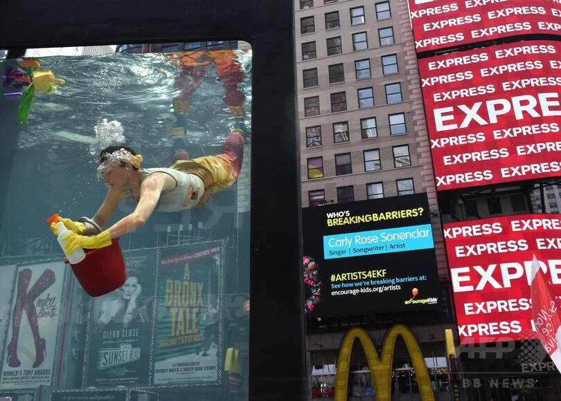 【6月1日 AFP】ドナルド・トランプ(Donald Trump)米大統領が地球温暖化対策の国際枠組み「パリ協定(Paris Agreement)」に関する決断を「あと数日で」発表すると明らかにし、世界が注視する中、ニューヨーク(New York)のタイムズスクエア(Times Square)に登場した巨大水槽の中で、気候科学をテーマにしたパフォーマンスアートが行われた。