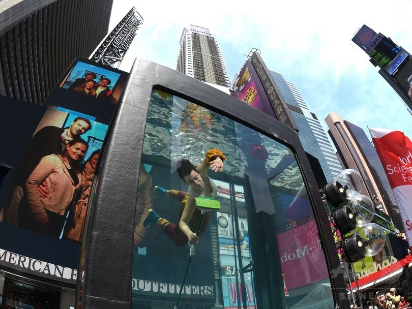 タイムズスクエアに巨大水槽、パフォーマンスアートで気候変動PR