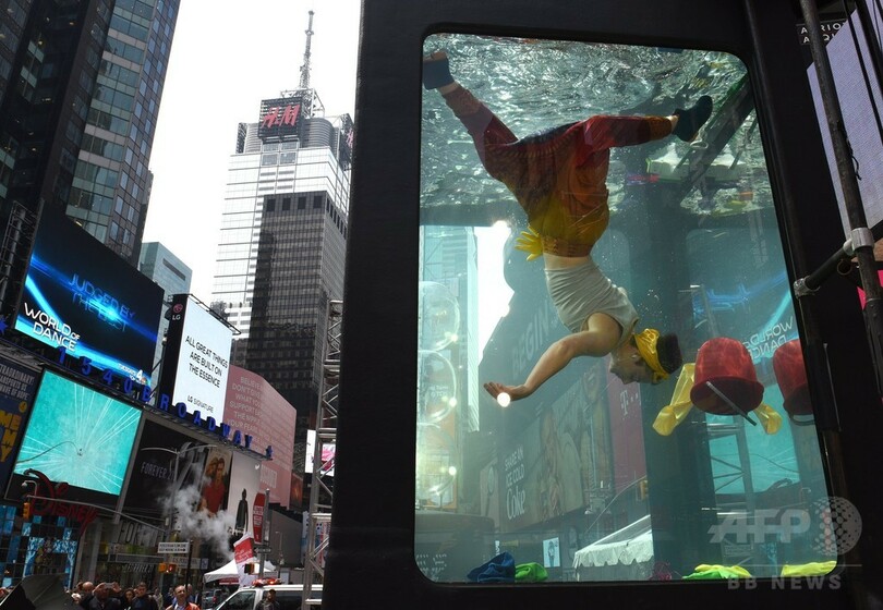 【6月1日 AFP】ドナルド・トランプ(Donald Trump)米大統領が地球温暖化対策の国際枠組み「パリ協定(Paris Agreement)」に関する決断を「あと数日で」発表すると明らかにし、世界が注視する中、ニューヨーク(New York)のタイムズスクエア(Times Square)に登場した巨大水槽の中で、気候科学をテーマにしたパフォーマンスアートが行われた。