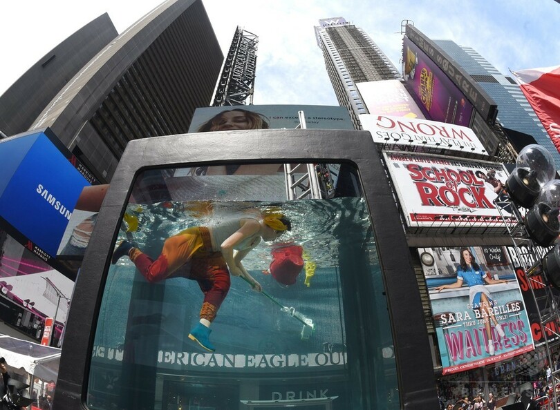 タイムズスクエアに巨大水槽、パフォーマンスアートで気候変動PR