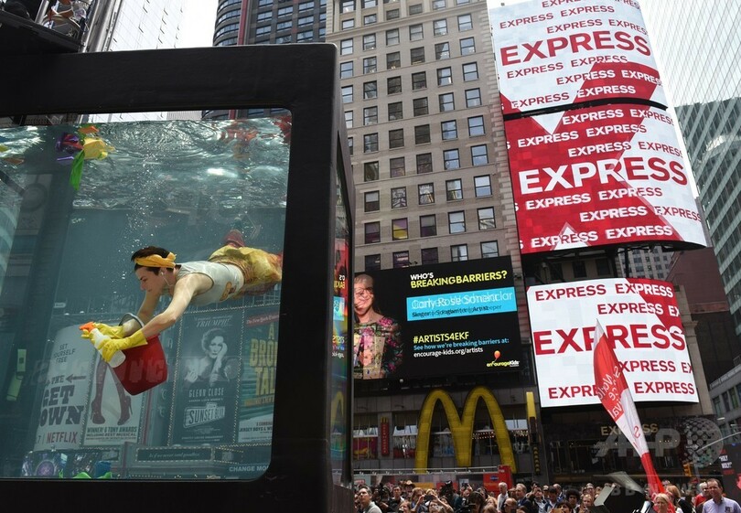 【6月1日 AFP】ドナルド・トランプ(Donald Trump)米大統領が地球温暖化対策の国際枠組み「パリ協定(Paris Agreement)」に関する決断を「あと数日で」発表すると明らかにし、世界が注視する中、ニューヨーク(New York)のタイムズスクエア(Times Square)に登場した巨大水槽の中で、気候科学をテーマにしたパフォーマンスアートが行われた。