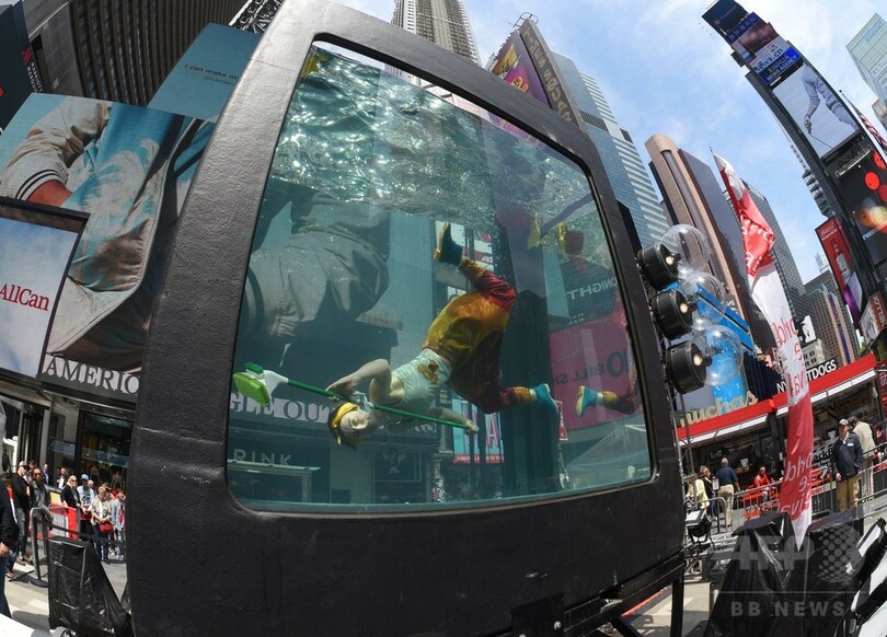 【6月1日 AFP】ドナルド・トランプ(Donald Trump)米大統領が地球温暖化対策の国際枠組み「パリ協定(Paris Agreement)」に関する決断を「あと数日で」発表すると明らかにし、世界が注視する中、ニューヨーク(New York)のタイムズスクエア(Times Square)に登場した巨大水槽の中で、気候科学をテーマにしたパフォーマンスアートが行われた。