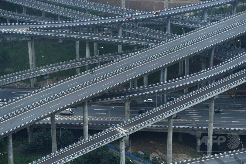 黄桷湾の立体交差橋は5層構造で、15の接続道路が8方向へ延びていくので、「重慶で最も複雑な立体交差橋」といわれている。(c)CNS/JCM/AFPBB News