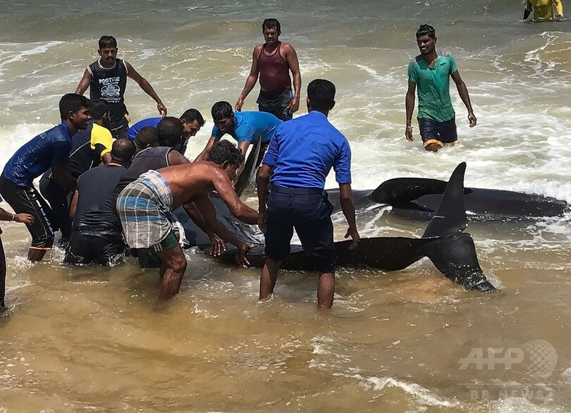 【6月1日 AFP】スリランカ当局者によると、同国北東部の海岸に約20頭のゴンドウクジラの群れが乗り上げているのが見つかったが、海軍兵士や地元住民らによって先月31日、無事救出された。